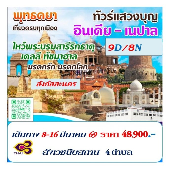| นำแสวงบุญ แดนพุทธภูมิ ประเทศอินเดีย-เนปาล สังเวชนียสถาน 4 ตำบล 9D/8N ไหว้พระบรมสารีริกธาตุที่ พิพิทธภัณฑ์เดลลี สังกัสสะนคร ลุมพินี (ประสูติ) พุทธคยา (ตรัสรู้) สารนาถ ปฐมเทศนา กุสินารา (ปรินิพพาน) สาวัตถี ราชคฤห์ นาลันทา พาราณสี ล่องแม่น้ำคงคา วัคอัคซาดาม (วัดฮินดู) นิวเดลลี มรดกโลก ทัชมาฮาล ป้อมแดง |