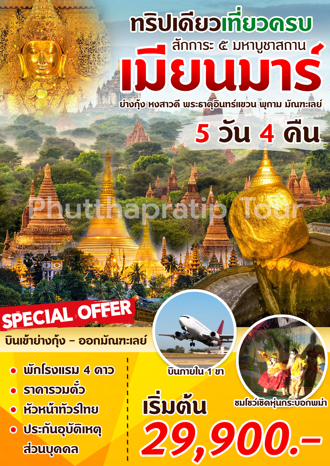 | วันที่ 5 | พระมหามัยมุณี - เมืองอมรปุระ - สะพานใม้อูเป็ง - ทะเลสาบตองตามัน - วัดมหากันตายง - สนามบินดอนเมือง |